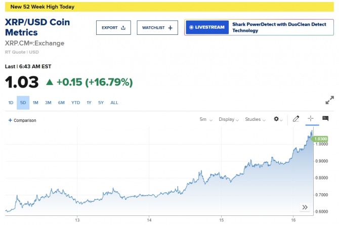 2023년 말 SEC와의 소송에서 부분 승소 판결이 나면서 리플은 한때 $0.9까지 급등했어요.